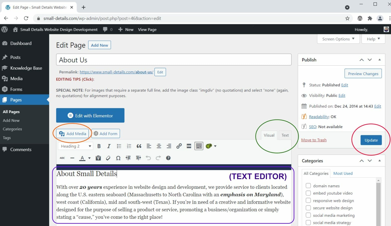 - If that’s everything you need to do click the blue “Update” button in the upper right to SAVE your work (see screenshot-blue button circled in red. This button will display “Publish” for newly created pages).