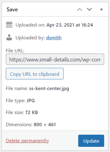 - You’ll see the group of gallery images currently displayed. It’s helpful if you can determine the appropriate image size for any new images you wish to include. To do that click on the “Edit” link under any one of the images. From the top “Image URL” field highlight and copy the link. Paste it into Notepad or Word and make note of the image name at the end of that URL (ex. “…/ss-kent-center.jpg”). Next, open your Media Library and type that image name into the “Search” field, top/right. The image should appear in the list. Click for details and you’ll see a panel similar to our screenshot (right or above). Make note of your image “Dimensions” (in this case 800 x 461 px). This is the approximate size your new image should also be.