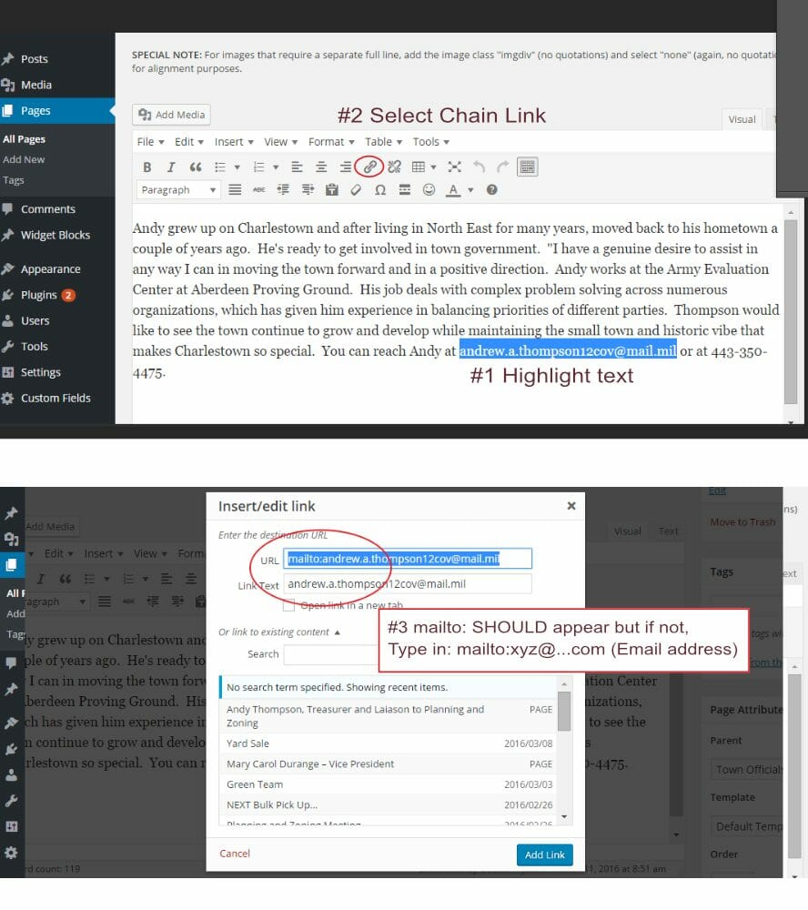 - Highlight the text, click the chain link and the address should show up in the URL field along with the directive “mailto:” directly before it (see screenshot). If you don’t see the mailto directive, simply add it manually (without quotations). Click “Add Link” button and you’re all set. This same method can be used for an email button. See below for linked buttons.